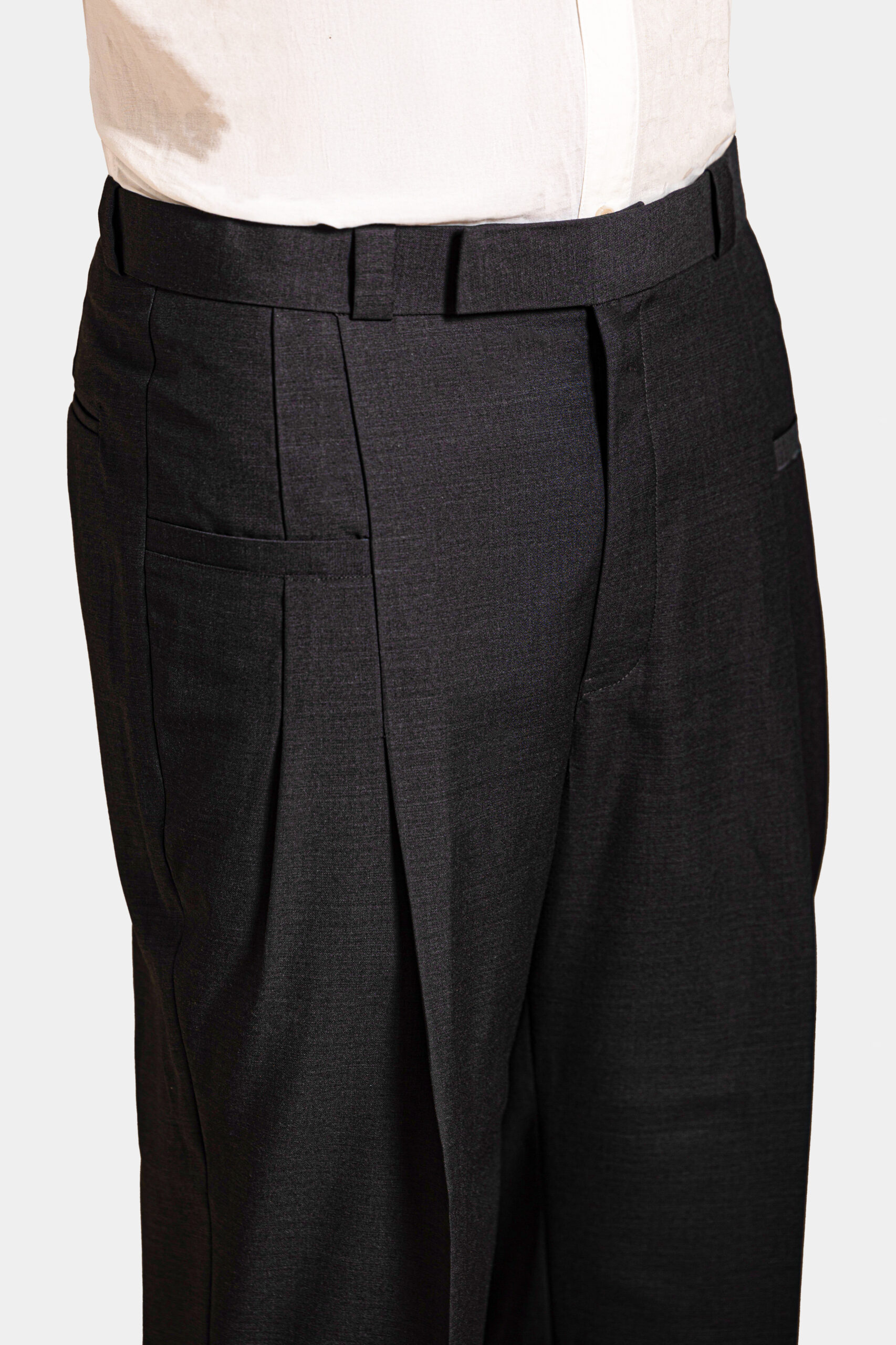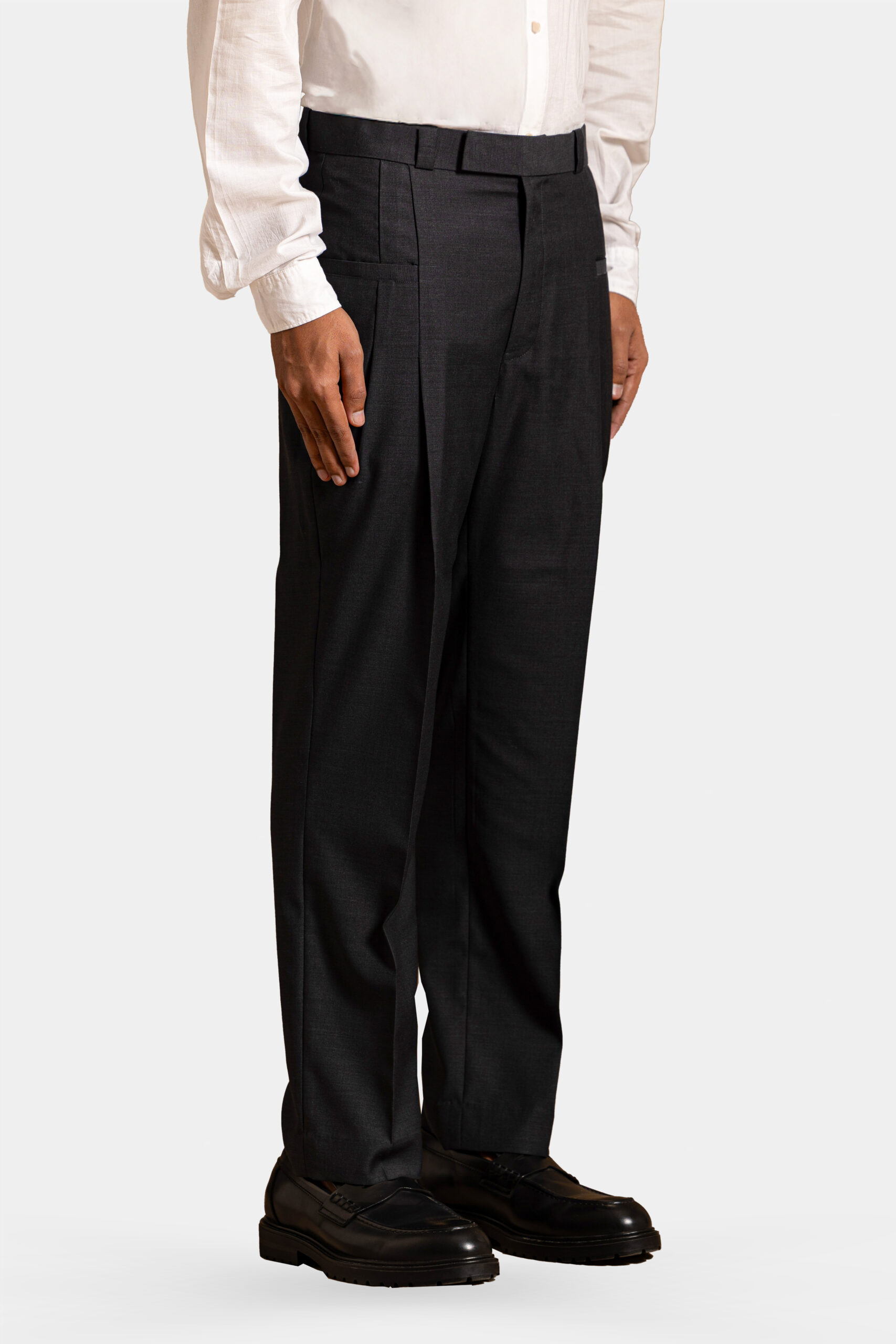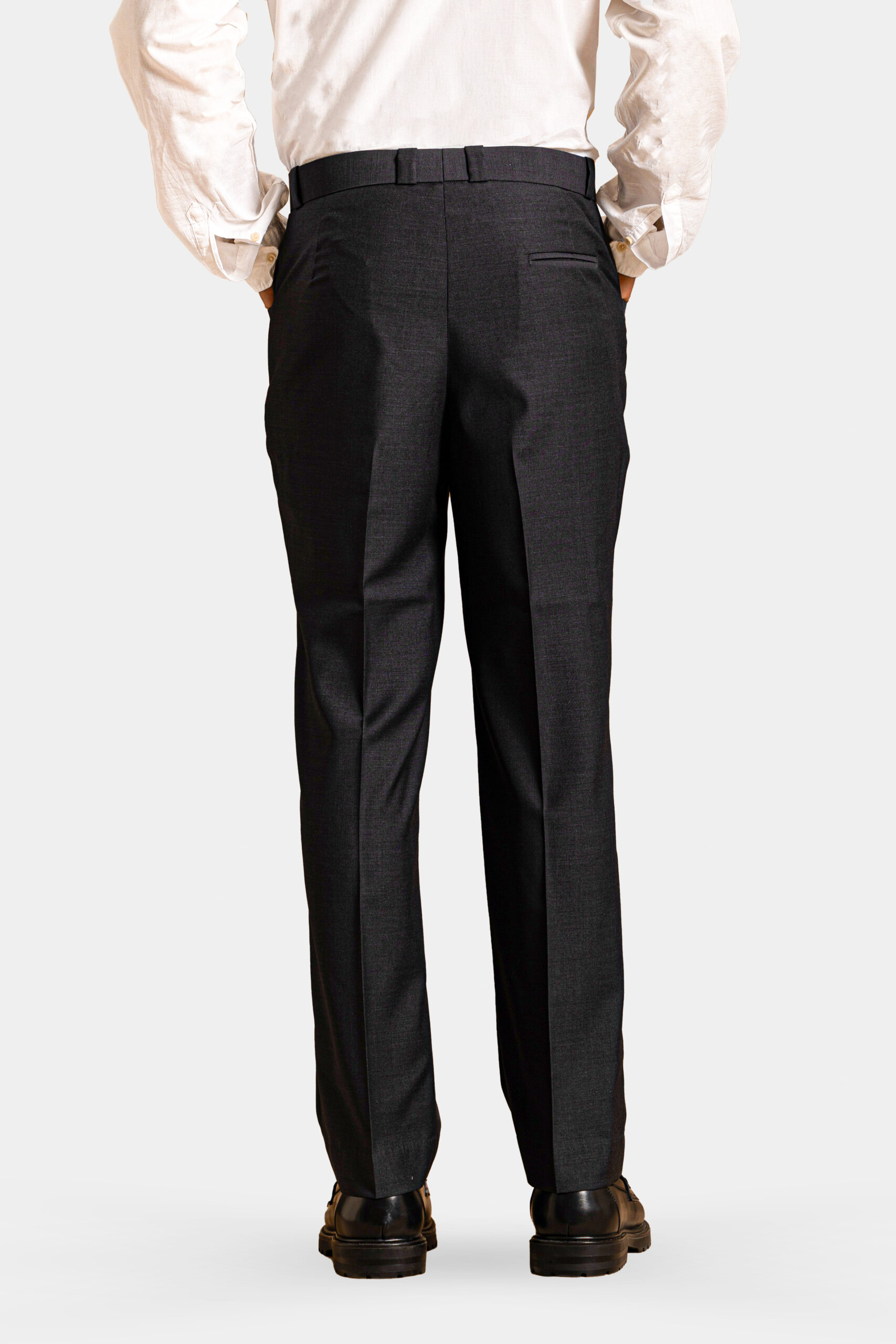 Dark Grey trousers crafted from Super 160s Merino wool. Sartorial design with welt pockets, perfect for formal elegance.
