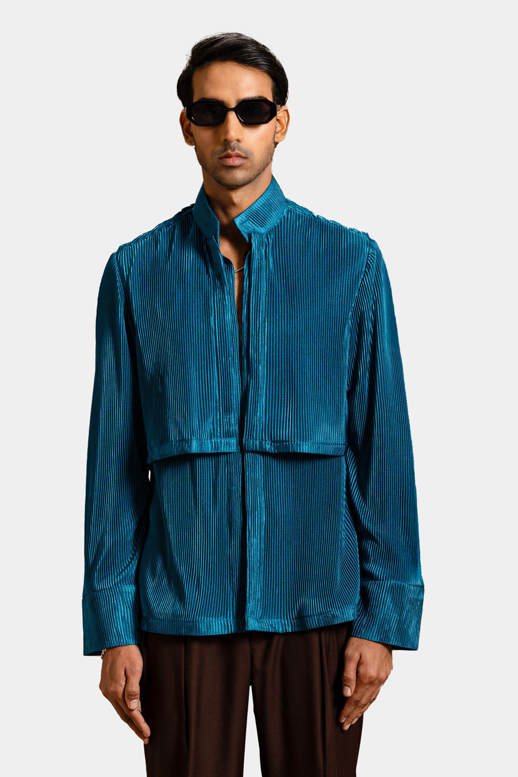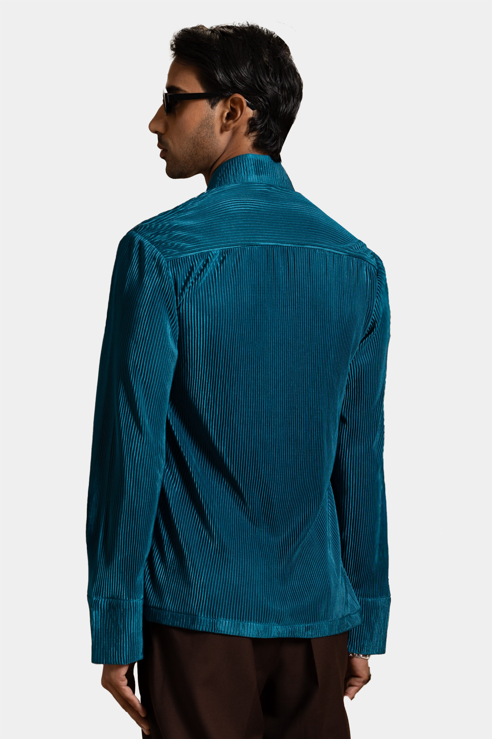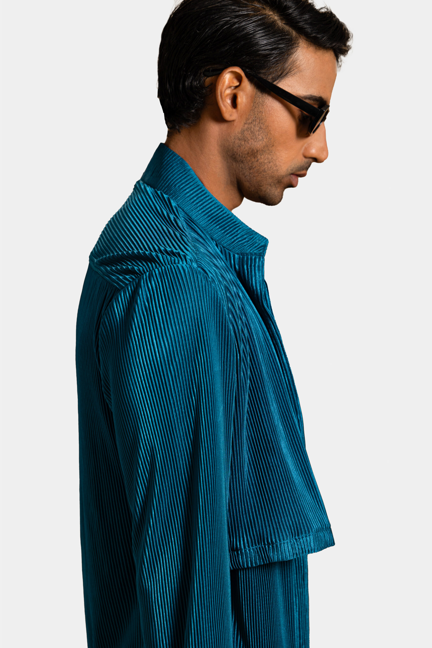 The Teal Pleated Shirt brings a sculptural edge to contemporary menswear. Designed in rich pleated fabric, this shirt features a structured, modern silhouette.