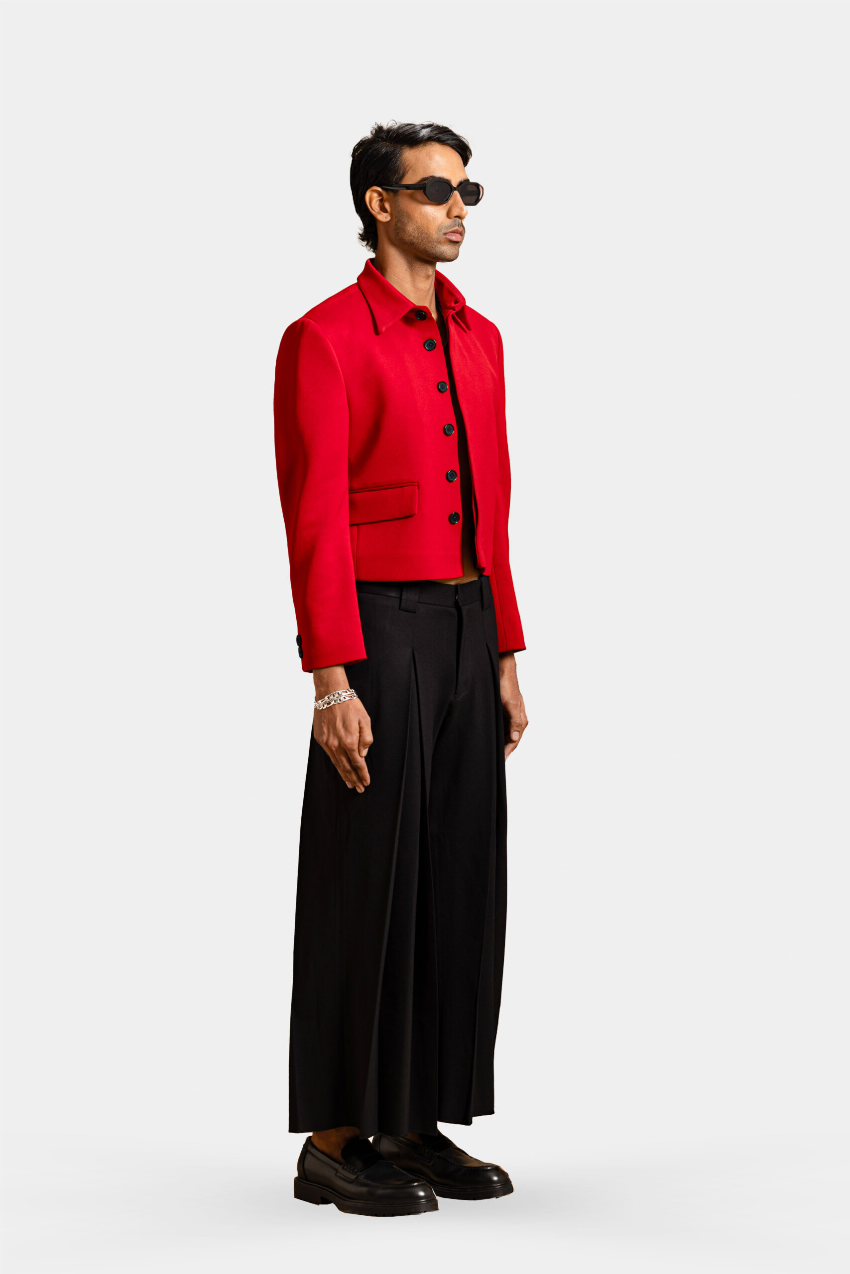 The Wayfarer Crop Jacket carries the essence of vintage voyages, designed in engineered fabric for precision. Paired with Boheme trousers , this ensemble is the epitome of modern luxury.
